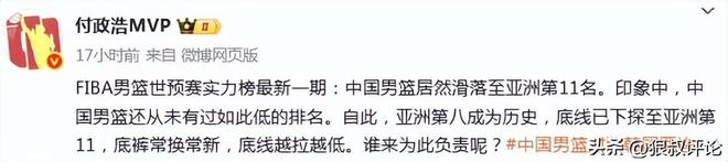 媒体人付政浩发文点评:“FIBA男篮世预赛实力榜最新一期:中国男篮居然滑落至亚洲第11名。印象中,中国男篮还从未有过如此低的排名。自此,亚洲第八成为历史,底线已下探至亚洲第11,底裤常换常新,底线越拉越低。谁来为此负责呢?”。